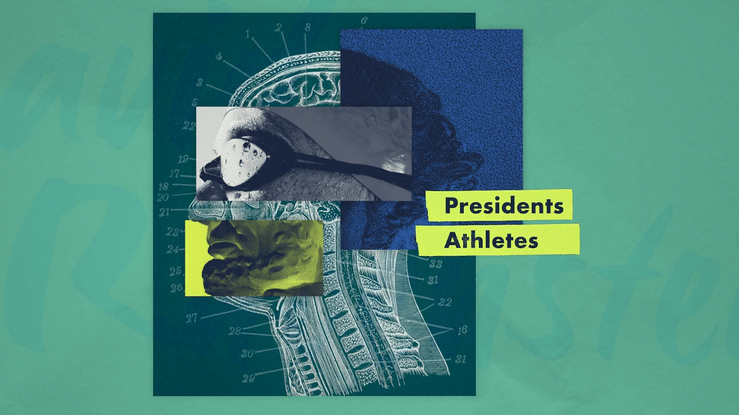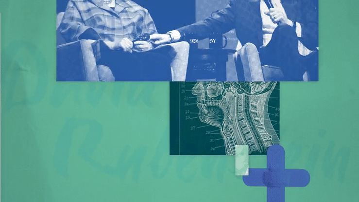 The concept inspiration combines collages of headshots and medical illustration archives, freely arranged in grid-like boxes and layered with vector illustrations of scientific visuals and expressive ink strokes.